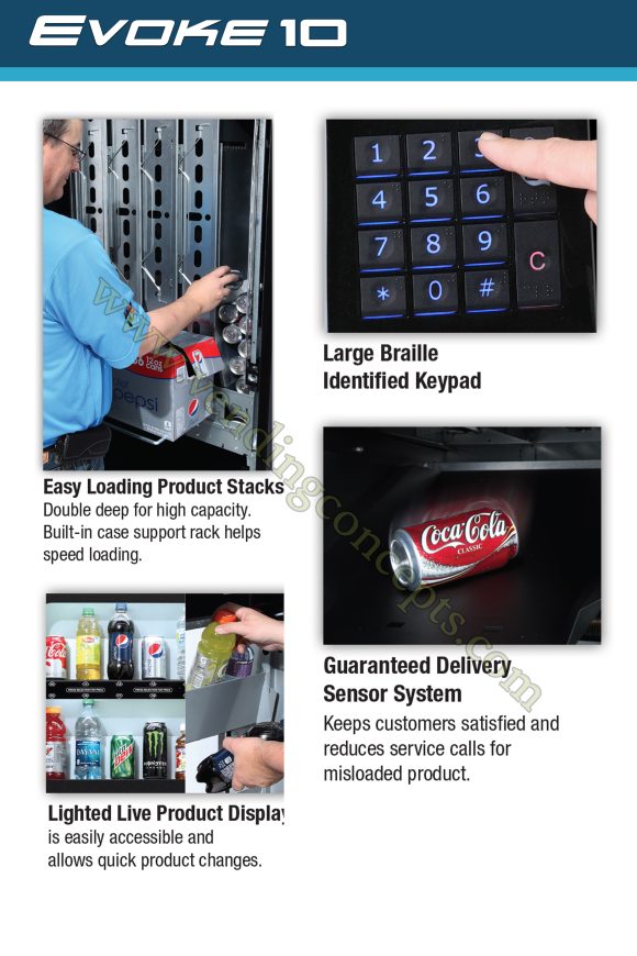 As one of the most energy-efficient and highest value products on the market, the Wittern Evoke 10 Drink Vending Machine features and eco-friendly design with low power consumption of only 3.6 kWh/day on average. It has energy-efficient dual area LED crisp lighting and uses a single power cord with low power consumption of only 7.0 Amps. Additionally, it offers the latest in electrical, lighting, insulation, refrigeration and vending technology.